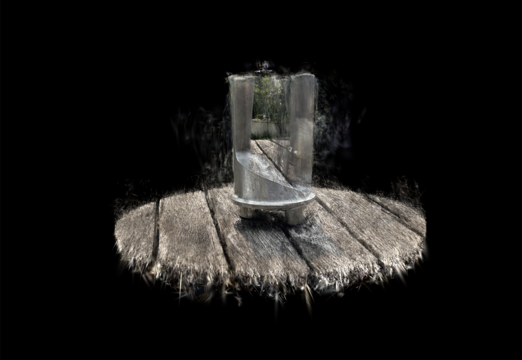 Le modèle GS révèle la schizophrénie du cylindre : à l’intérieur, un fragment de jardin hors-champ — arbres, végétation — capturé dans le reflet de l’aluminium poli. À l’extérieur, le chaos : le bois de la table explose en filaments, les splats se désintègrent en périphérie comme une matière en décomposition.